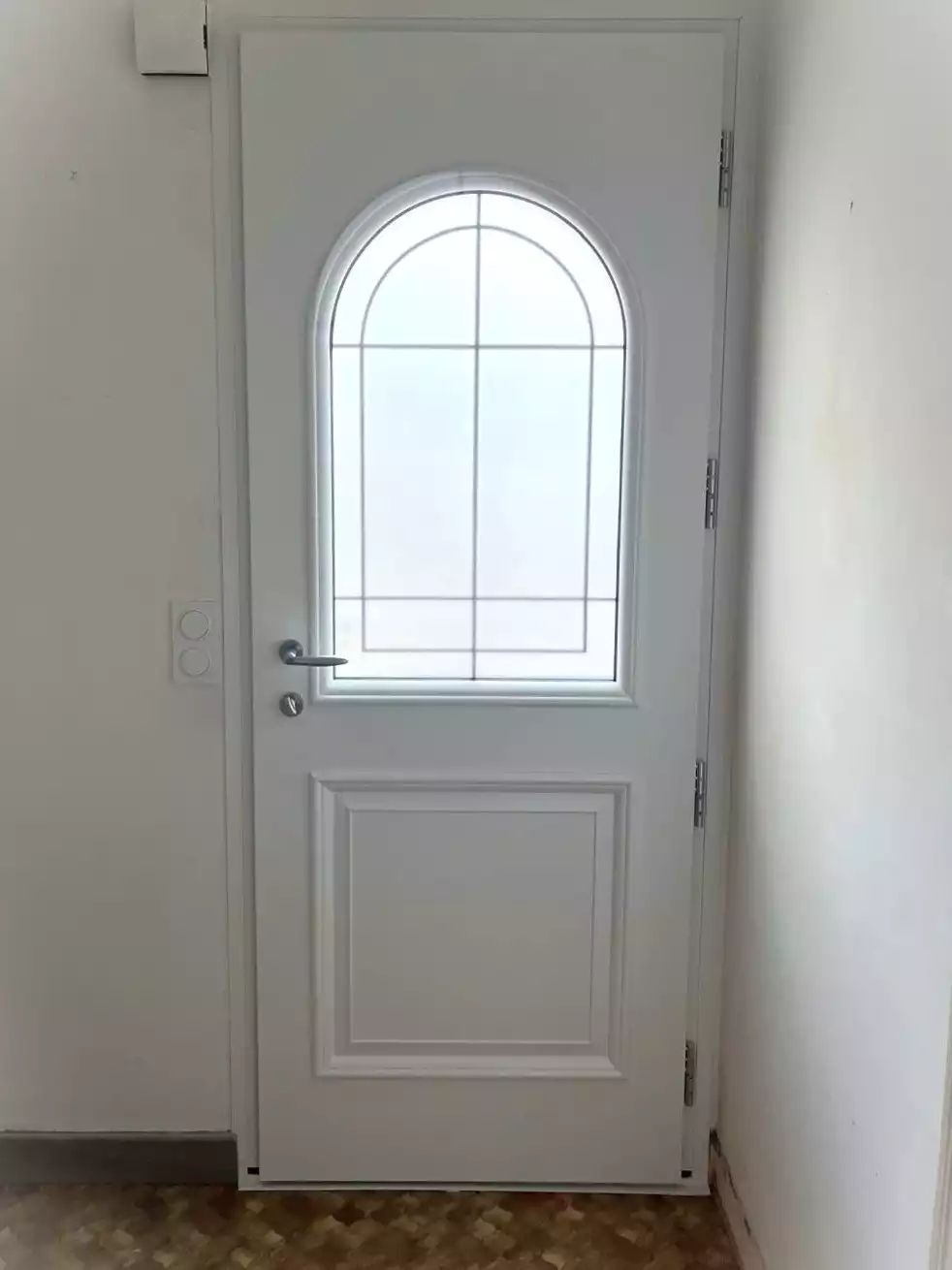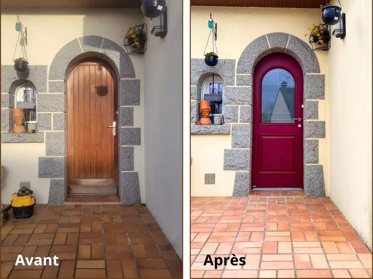 Dans cette maison des années 70, la porte d’entrée d’origine ne répondait plus aux attentes d’aujourd’hui. Peu isolante, assombrissant l’entrée et difficile à entretenir, elle créait des pertes de chaleur… et un vrai inconfort pour les occupants.