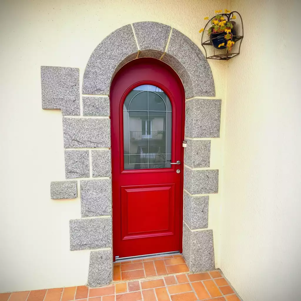 Plutôt que de fabriquer une porte totalement cintrée — une option nettement plus onéreuse dans les maisons en pierre — nous avons proposé une alternative sur mesure : une porte rectangulaire parfaitement ajustée, complétée par un arc de finition qui respecte l’allure authentique de l’ouverture.